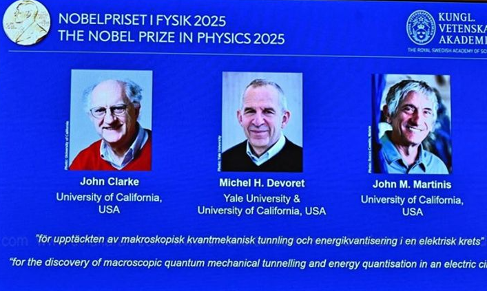2025-ம் ஆண்டு இயற்பியலுக்கான நோபல் பரிசு 3 பேருக்கு கூட்டாக தேர்வுக் குழு அறிவித்துள்ளது. ஸ்வீடன் தலைநகர் ஸ்டாக்ஹோமில் இயற்பியலுக்கான நோபல் பரிசை தேர்வுக் குழு அறிவித்தது. ஜான் கிளார்க், மைக்கேல் ஹெச்.டெவோரெட், ஜான் எம்.மார்ட்டினிஸ் ஆகியோருக்கு அறிவிக்கப்பட்டுள்ளது.குவாண்டம் இயற்பியலில் அவர்களின் பங்களிப்புக்காக நோபல் வழங்கப்பட்டுள்ளது.அதாவது,மின் சுற்றுகளில் மேக்ரோஸ்கோபிக் குவாண்டம் முறையில் இயந்திர சுரங்கப்பாதை மற்றும் ஆற்றல் அளவீட்டை கண்டுபிடித்துள்ளனர்.