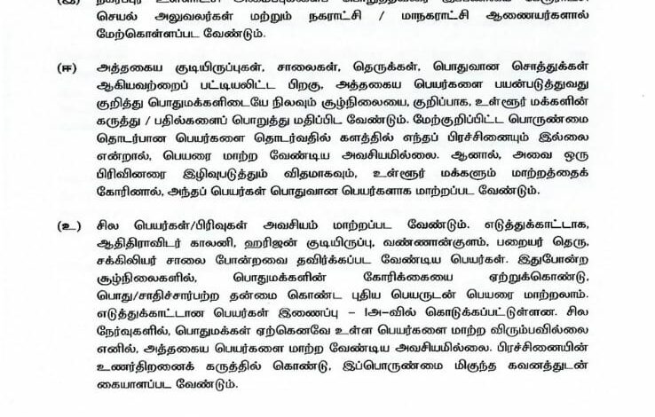ஊர்கள் தெருக்கள் குளங்களின் பெயருக்கு பின்னால் உள்ள சாதி பெயர்களை நீக்க தமிழ்நாடு அரசு அரசாணை வெளியிட்டுள்ளது அதன்படி ஆதிதிராவிடர் காலனி, ஹரிஜன்குடியிருப்பு, வண்ணான் குளம், பறையர் தெரு, சக்கிலியர் சாலை உள்ளிட்ட பெயர்களை நீக்க உத்தரவிட்டுள்ளது. இந்த பணிகளை நவம்பர் 19ஆம் தேதிக்குள் முடிக்க வேண்டும் எனவும் ஆணையிட்டுள்ளது.