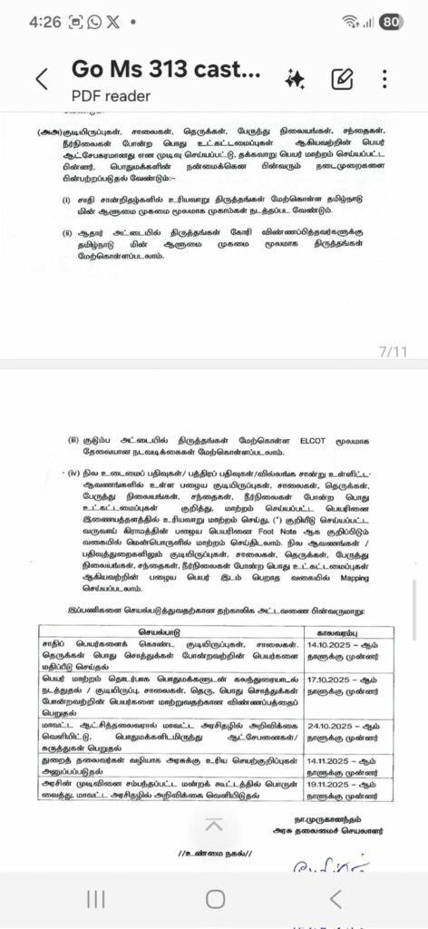 குடியிருப்புகள், தெருக்கள், சாலைகள், நீர் நிலைகள் உள்ள சாதிப் பெயர்களை நீக்க அரசாணை..
