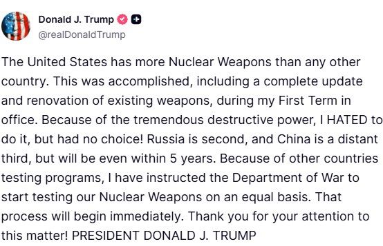 மற்ற நாடுகளின் பரிசோதனை திட்டங்களை கருத்தில் கொண்டு, நம்முடைய அணு ஆயுதங்களை சம அளவில் பரிசோதிக்க ‘Department of War’க்கு வழங்குகிறேன். இது உடனடியாக தொடங்கும்